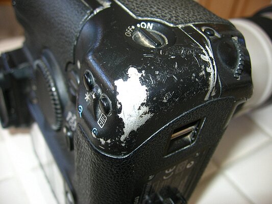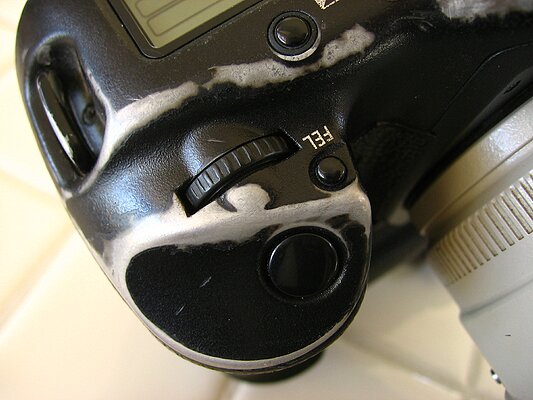 I use exposure compensation all the time, and the area around my exposure comp button is heavily worn. (Please note that on the "factory settings" Canon does not have the exposure button here. I made this change by hooking it up to the computer and reassigning the button, so as to emulate the exposure compensation button position on my Nikon D1X which I was so familiar with, before being relieved of them when I was robbed in Lima Peru.