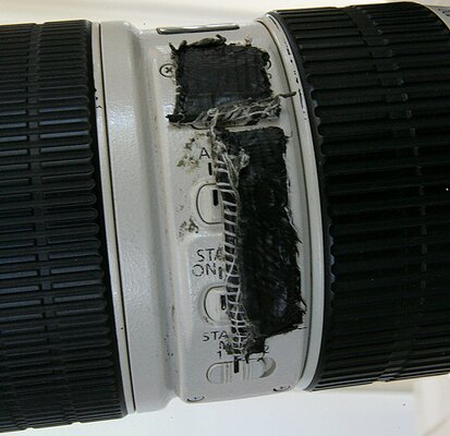 A while ago I used clear tape and pieces of toothpicks to keep the focus limit switch and the stabilizer buttons in the positions that I wanted them in. Eventually the clear tape fell off. I needed a fix, but at the time, I was in rural, upcountry East Timor and all I could get my hands on was some black duct tape.