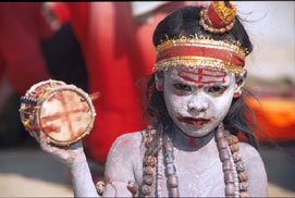 A child Sadhu, covered in ash, beats a drum to attract donations.