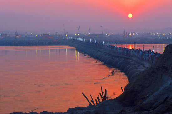 Once every 12 years, millions of the world's most zealous Hindu pilgrims gather at the confluence of the Ganges and Yamuna rivers near the city of Allahabad for the greatest of India's immersion rituals, the Maha Kumbh Mela. This year's Maha Kumbh Mela is particularly auspicious, being the first of the new millennium and coinciding with an astrological planetary alignment occurring only once every 144 years. By the time the 2001 Kumbh Mela ends on February 21st, approximately 70 million saints, sinners, Sadhus, faith healers, preachers, gurus, charlatans and devotees from across India and the world will have participated in perhaps the single most colossal gathering of humanity since the dawn of time.