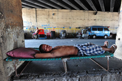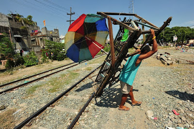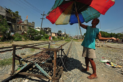 Under a highway bridge, just 2 meters from the railroad tracks, about 20 families have set up living quarters, each family staking out a spot large enough to construct a makeshift bed from cardboard, wood, or discarded mattresses. This family with four children have been living here for 4 years. The man works as a motorcycle taxi driver earning about 100 pesos a day ($2.25 US). The children play along the tracks, keeping a sharp eye open for oncoming trains.