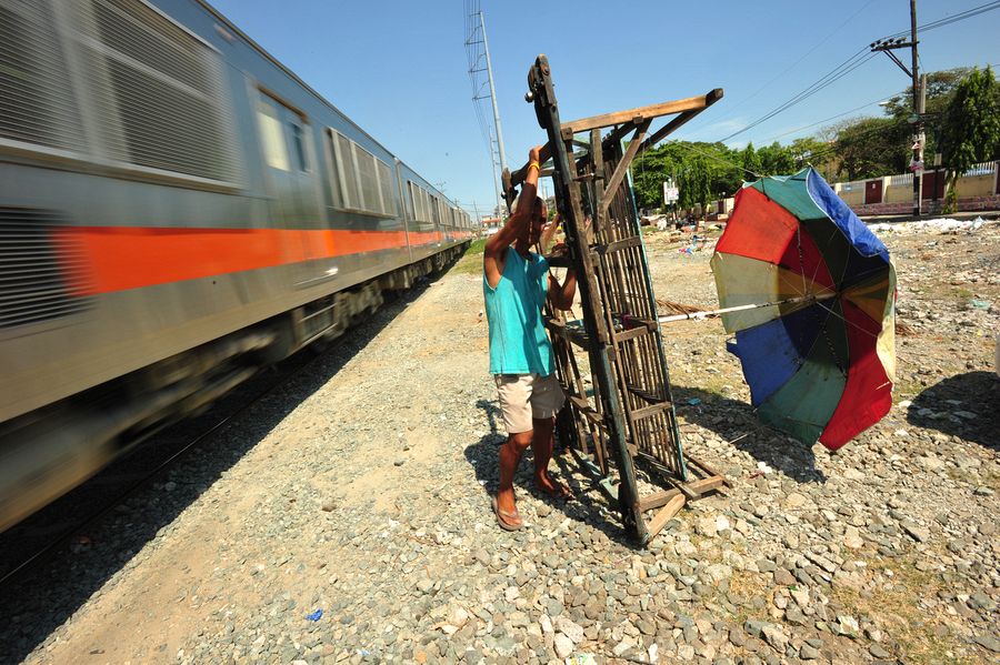 Under a highway bridge, just 2 meters from the railroad tracks, about 20 families have set up living quarters, each family staking out a spot large enough to construct a makeshift bed from cardboard, wood, or discarded mattresses. This family with four children have been living here for 4 years. The man works as a motorcycle taxi driver earning about 100 pesos a day ($2.25 US). The children play along the tracks, keeping a sharp eye open for oncoming trains.