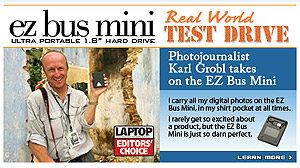 Now, about that "down my pants" comment. Well, I always worry about being held up by thugs during my long overseas assignments to those "not so safe places", or being relieved of all my stuff at some road block in Haiti or Sudan by underpaid, less than scrupulous, military or government personnel...so I carry all my digital photos on the EZ Bus Mini, in my shirt pocket at all times. If I feel like things are getting dicey, I move the EZ Bus Mini from my shirt pocket down into the front of my pants, in the hope that no one is not going to look "down there" for valuables. Since the EZ Bus Mini is small, robbers will either miss it all together, or just think that I'm well endowed.
