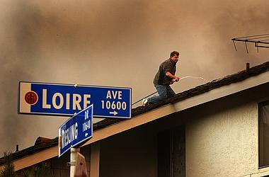 a man grabs a garden hose and climbs atop a burning home to extinguish