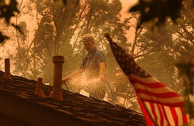 down dry wooden shingles as winds howl, driving flames ever closer.