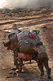 Sok, Sopat and Kosal push their "finds" up a long winding hill towards