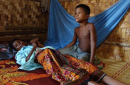 Boy watches over his mother, dying of aids, in a slum near Phnom Penh, Cambodia
