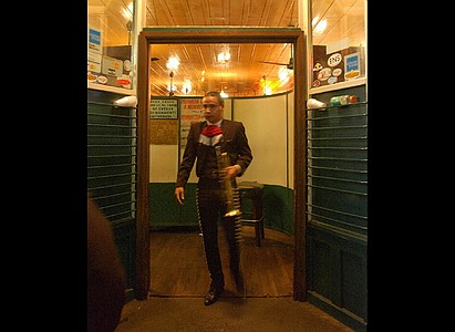 Mariachi Trumpet player exiting Hussongs Cantina, Ensenada, Mexico